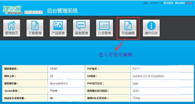 在后台管理中心(如上图)点击“可视编辑”或“首页预览”或在管理员登录的状态下访问前台均可进入网站在线编辑模式,进入编辑模式后网站前台将出现如下图工具栏: