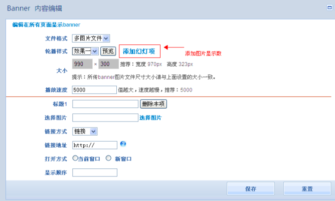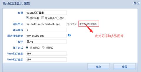 点击添加flash幻灯项可设置多张图片幻灯展示效果,flash幻灯宽度和高度可设置模块的宽度和高度值。数字不宜太大,不能超过区块的实际宽度。