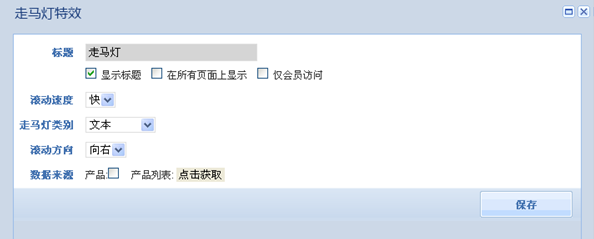滚动方向:向右、向左、向下、向下四种形式。 数据来源:调用产品管理中可以选择 1.按照分类选择 2.选择显示所勾选产品。