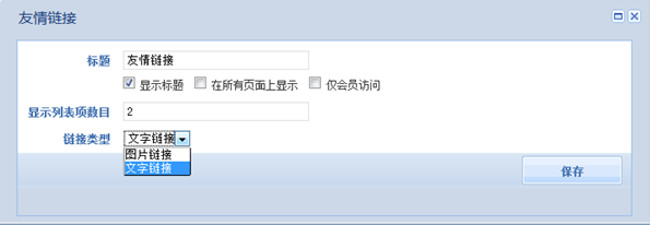 2. 友情链接:操作类似登录模块。显示列表项数目字段,输入您希望显示的友情链接图片数,选择是文字链接或者图片链接。这里直接设置相关信息。