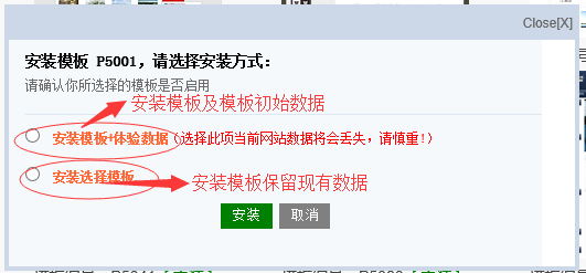 在这里您可以选择使用官方当前发布的模板,选中任意模板可点击缩略图下面的“安装”按钮进行模板安装。目前模板切换并未对外开放,如需切换模板请咨询技术部。